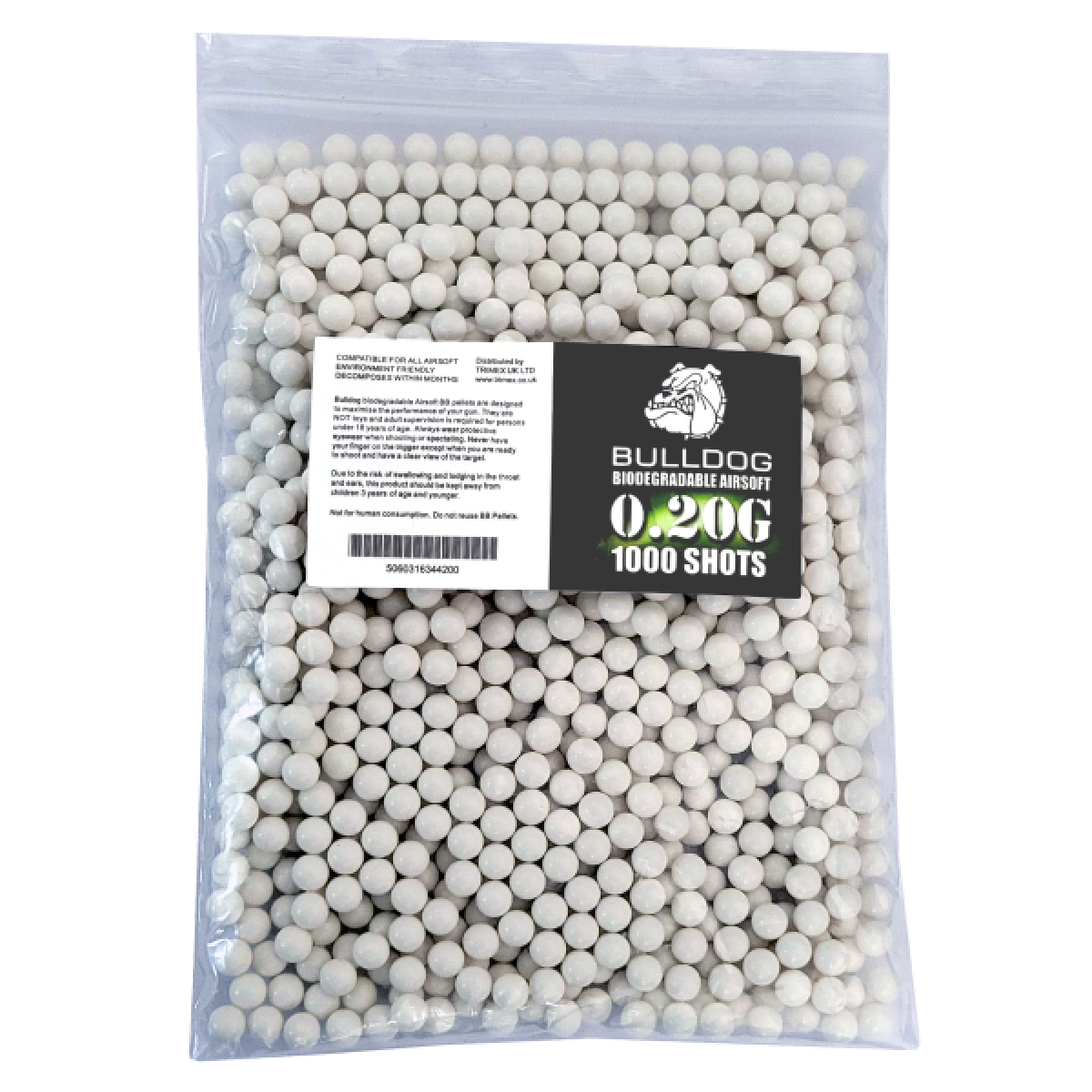 Resealing bag of 1000 biodegradable white 0.20g 6mm Bulldog Airsoft BBs, designed to optimize the performance of all Airsoft guns.