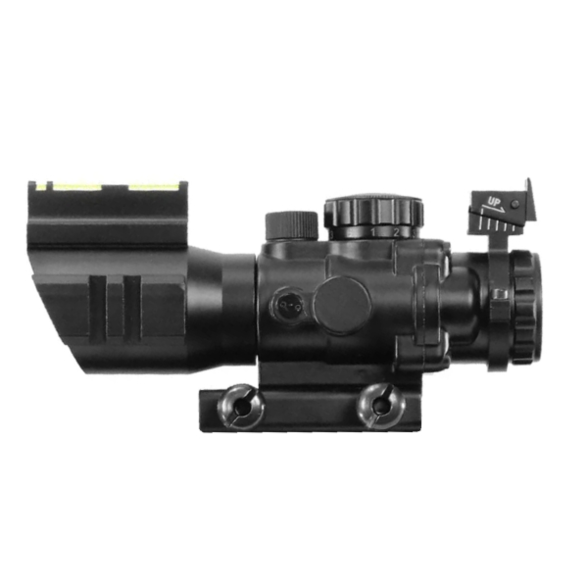 4×32 Dual ILL Tactical Compact Scope, equipped with fibre optic sight for quick acquisition. 100% shock, recoil, fog proof and nitrogen filled. Dual illumination with glass edged reticle, pre-set parallax, adjusted for 100 yards. Multi-coated lens for bright and sharp optical clarity. Select from RED / GREEN / BLUE with 5 illumination settings for each