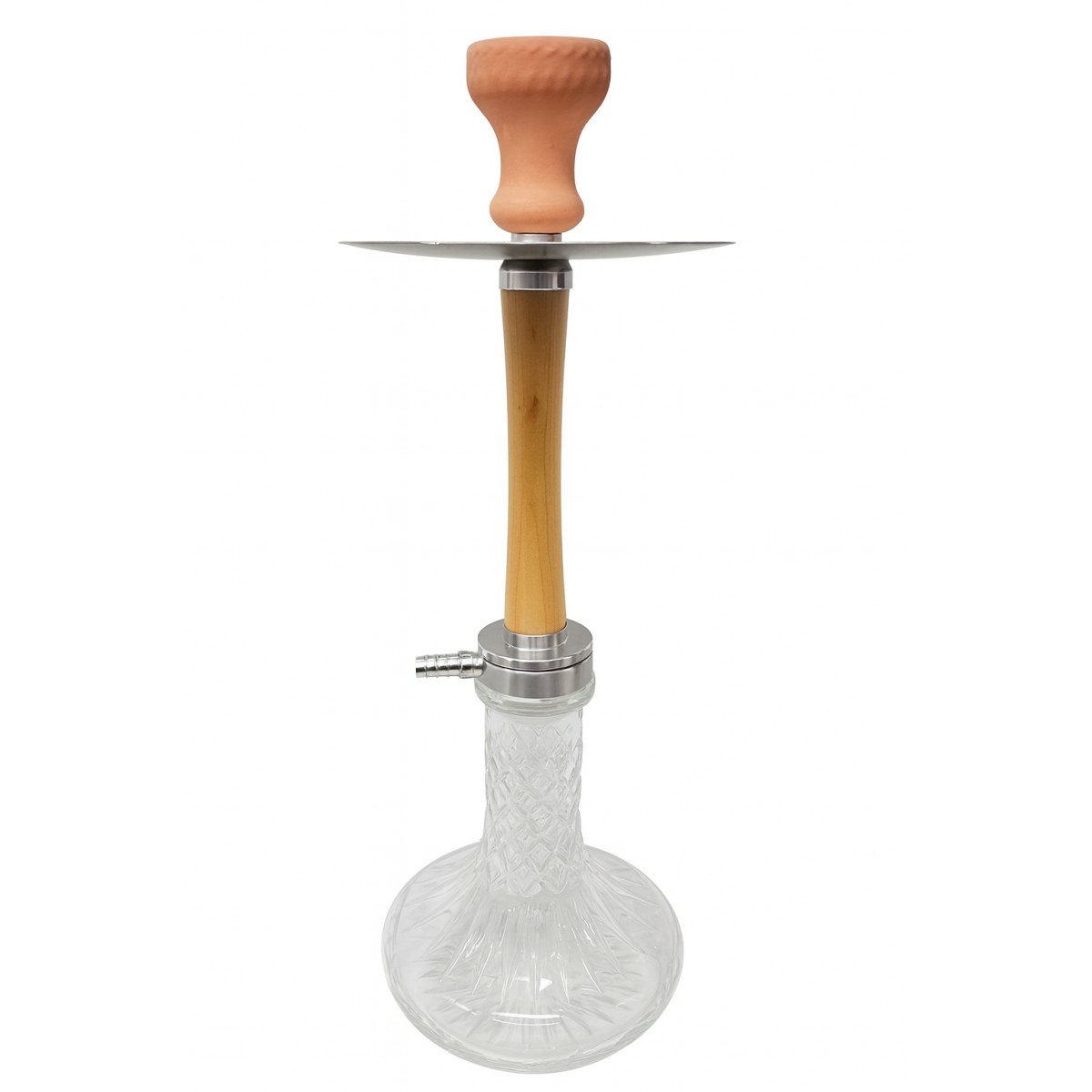 A premium hookah featuring a beautifully cut glass base and a smooth wooden stem, paired with a traditional clay bowl and metal tray. Available in mixed colour variations, this hookah adds a touch of style and luxury to any smoking setup.