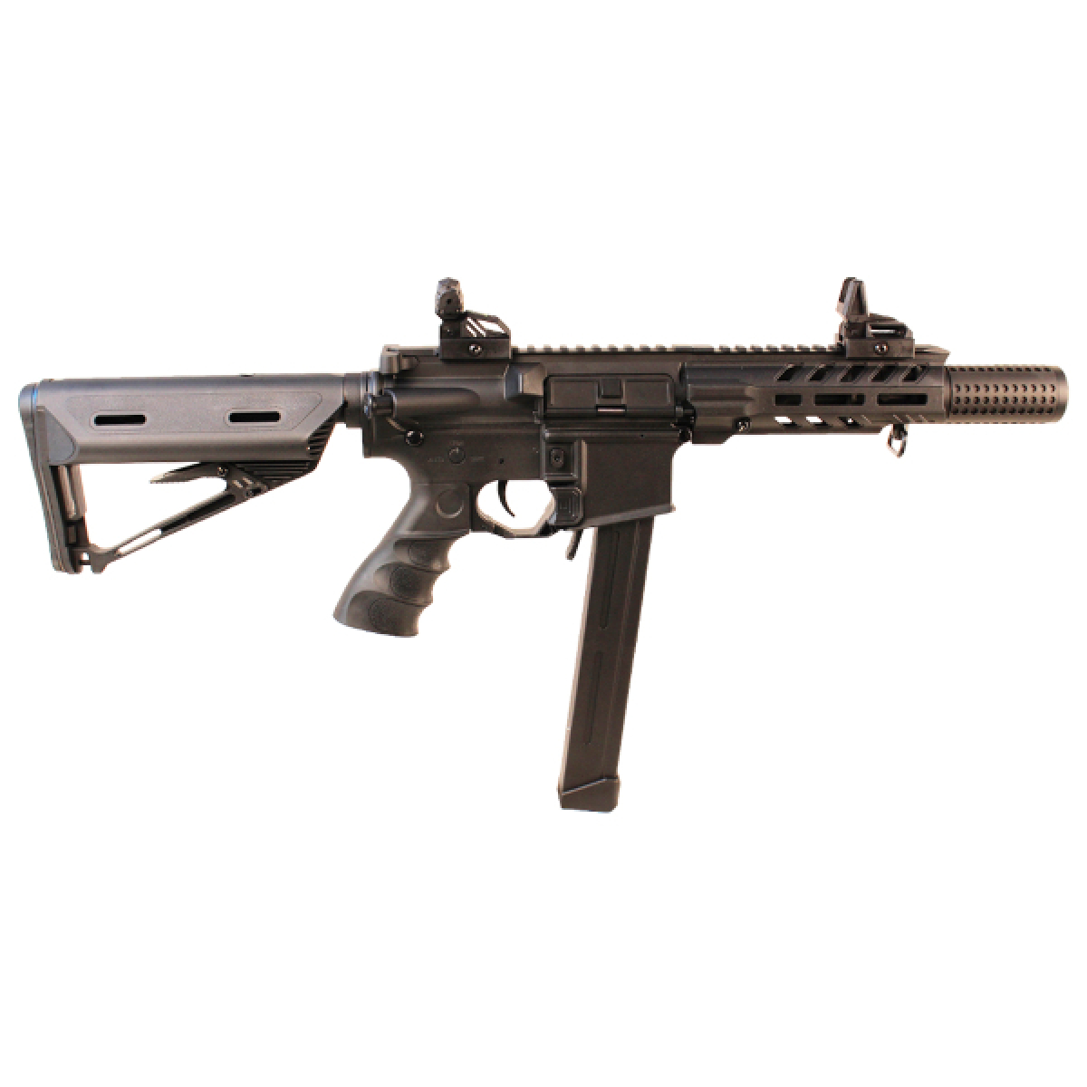 This is the new Falcon W-QD AEG Airsoft Gun, it is an AR-style 9mm PDW. It has a QD sling mount, 3 Position Stock, and an adapter for both 9mm and M4 magazines which makes it a versatile platform. Also, it features a new hop-up type and fibre-optic flip-up front and rear sights.