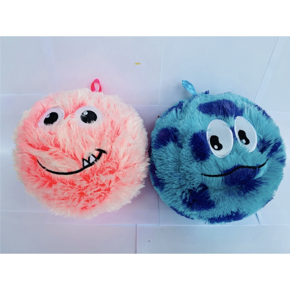 Design: Round, fluffy ball shape with embroidered cartoon eyes and mouths