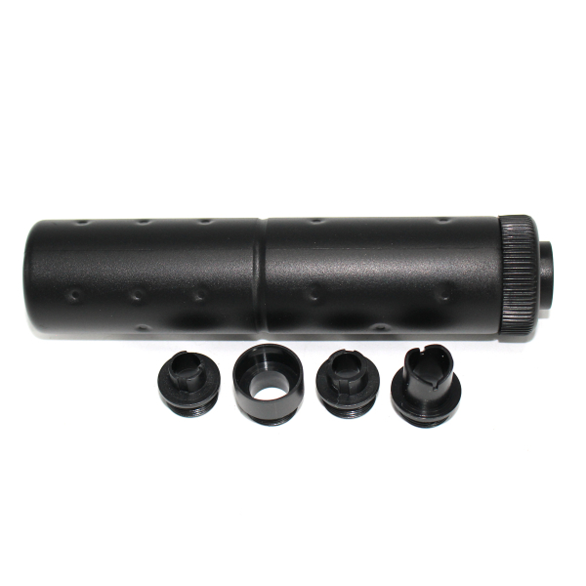 This airsoft silencer from HFC is manufactured using solid ABS and it has a standered M-14 thread plus converters to enable this silancer to be fited to almost any pistol, tactical gun or rfle. It will even fit on pistols without a barrel thread thanks to the converters supplied.